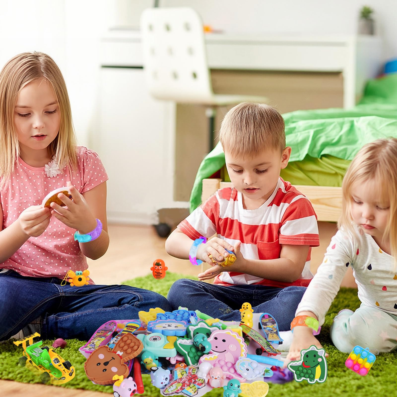 - FIDGET POPPER PACK SET: 5 Pop Bubble, 10 Mini Pop Bubble, 2 Race car, 2 Toy camera, 1 Puzzle Box, 1 Soccer Ball, 2 Pop Bracelets, 4 Stretchy String Fidgets, 4 Pop Tubes, 4 Mochi Squishies, 4 Pull back car, 5 Slap bracelet, 4 Maze, 2 Plastic skateboard, 5 Spiky Balls, 5 Whistle, 100 Stickers, etc.