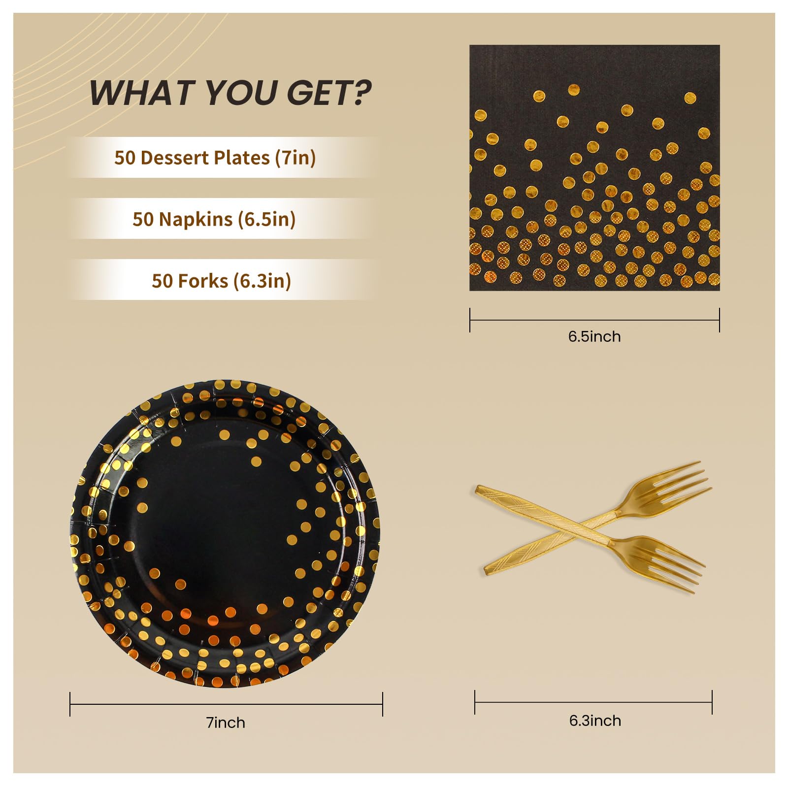 - 【50 GUESTS PARTY TABLEWARE SET】 In this black and gold tableware set, you will get 50*7 inches dinner plates and 50*6.5 inches napkins and 50 sets of gold forks. Perfect for serving salads, desserts, cakes, appetizers and more. Enough to meet your party needs, it's a great choice for your party tableware!