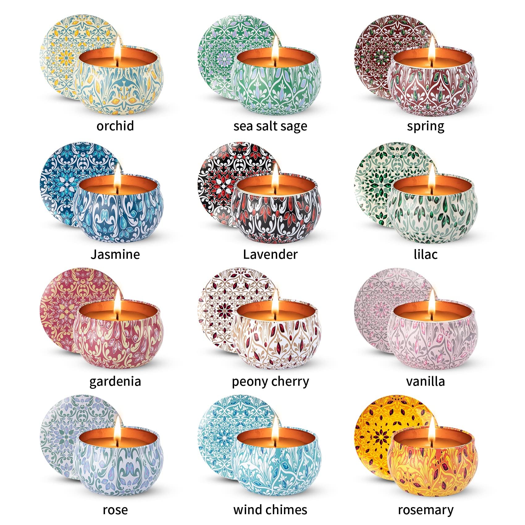 - 【12 FRAGRANCES】 The scented candles set includes 12 types of nice scents: rose, lavender, vanilla, gardenia, jasmine, vanilla,spring, sage, rosemary, orchid, cherry, lilac and chimes. Apply these candles scents for freshing air, relaxing body and mind when you doing spa, bath, yoga or massage etc.