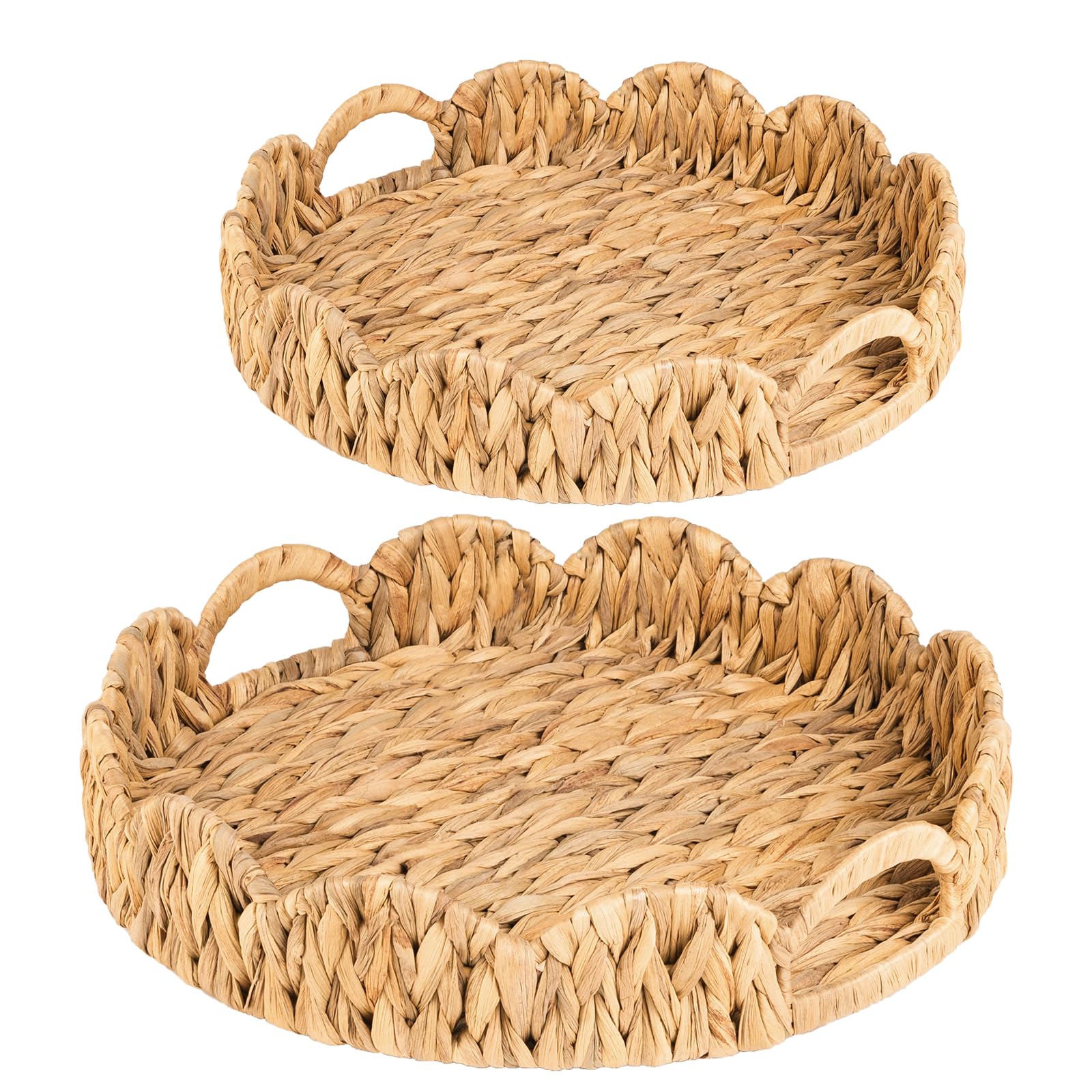 ATEDIR Round Serving Tray, 2-Pack Wicker Basket Tray with Handles, Rattan Woven Decorative Serving Tray, Natural Water Hyacinth Scalloped Tray for Home Decor and Desk Organizer Tray