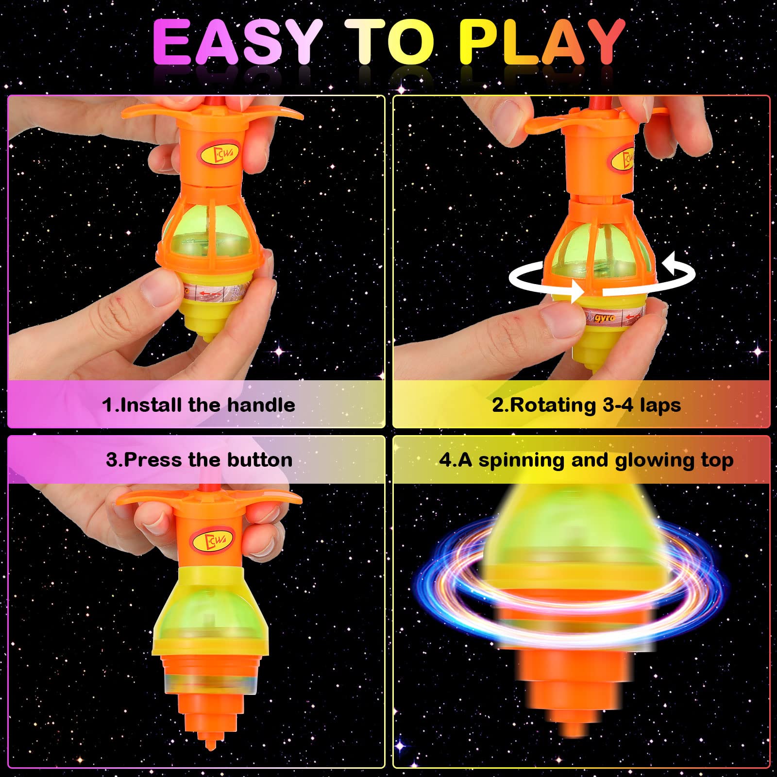 - Easy and Funny: the flashing spinner light toy is easy to play, you just need to attach the gyroscope to the top and twist the handle 3 times then press the button; After that, these light up spinner toys will spin and glow, which is very funny and suitable to play together with others