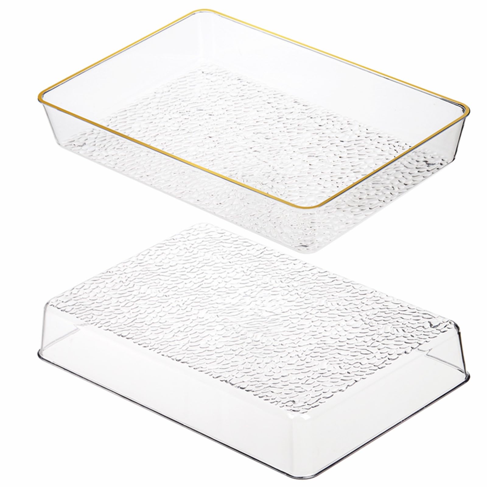 Cididu 4 Pack Clear Serving Trays, Deep Serving Platters Rectangle 12'' x 8'', Decorative Tray with Gold Rim, Reusable Plastic Tray Organizer for Coffee Table Pantry Party Food Display Spill Proof