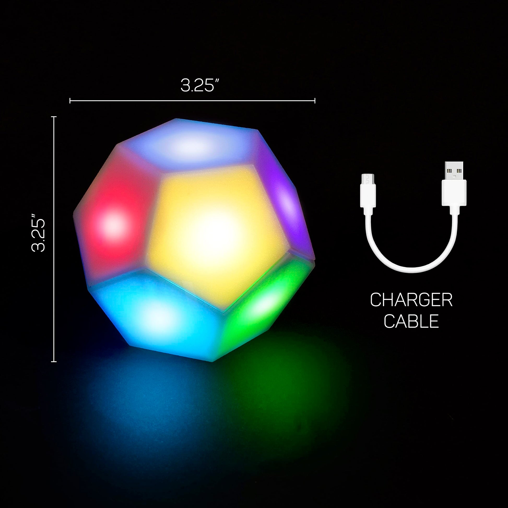 Details: eFidget is the first light-up fidget toy. Featuring two modes: Fidget and Chill. Fidget Mode: Your job is to turn each side to the top until all the sides become the same color, then feel the smooth vibrating pulse and watch the silent light show. Next, the colors will scramble and reset and you can fidget until your heart’s content. Chill Mode: eFiDGET will create flowing colors perfect for chilling. You can put it down and watch it or pick it up and see the colors change as you turn it. A full battery charge will last at least two hours. If you’d like eFiDGET to stay on for a long time (like a night light), you can plug in the charger cord and chill forever! Product: 3.25in x 3.25inx 3.25in