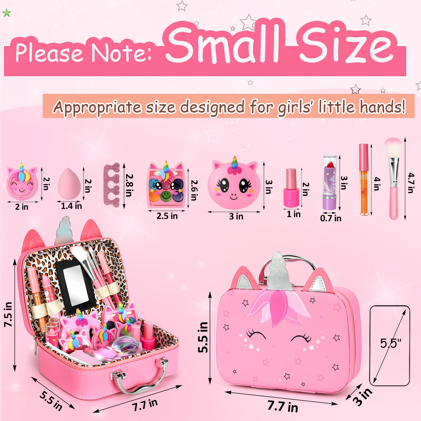 - TODDLERS MAKEUP TOY WITH KIDS MAKEUP CASE: Kids makeup case has a small mirror and a strap that can hold makeup brushes, just like a professional makeup case. The capacity is enough for little girls to organize all of her make up set which wonβt make a mess everywhere. Little girls could conveniently carry her beloved makeup kit to everywhere as well. Mom don't worry about what gift to buy for the little girl, just buy Heaning kids makeup kit for girls