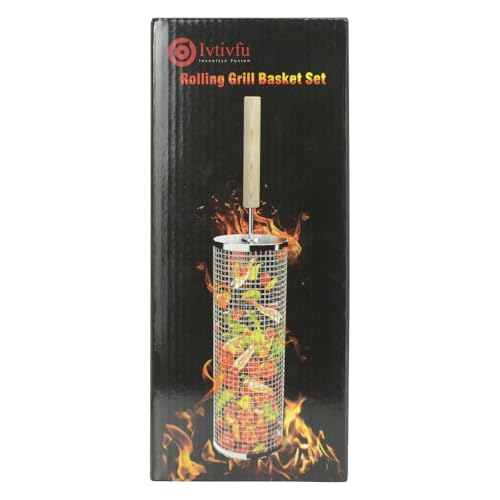 ivtivfu Rolling Grill Baskets, Removable Wooden Handle, 304 Stainless Steel, Nesting Grilling Net, BBQ Accessories Tools for Vegetable Shrimp, Outdoor Cooking Camping, Birthday Gifts for Men Dad Husband
