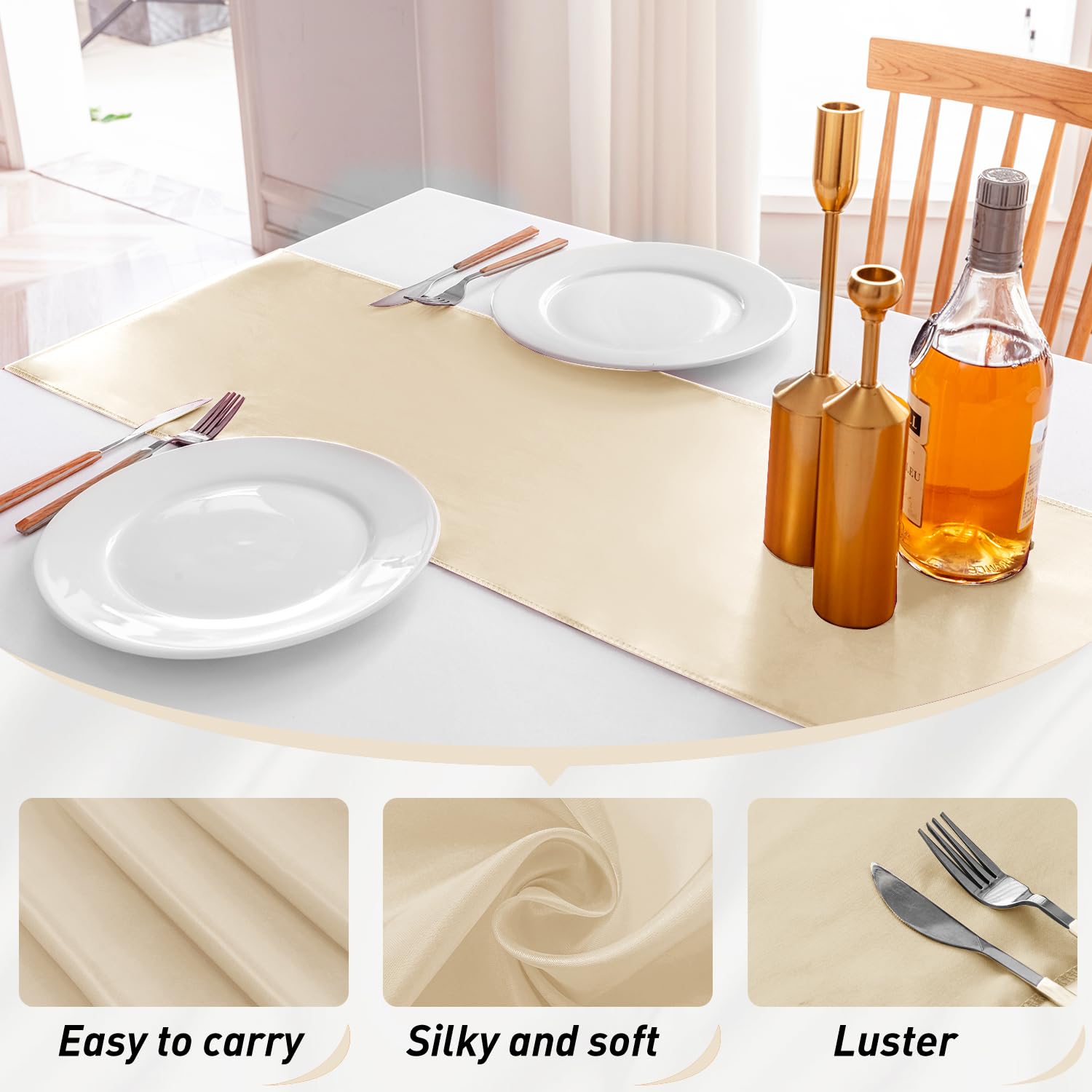 - This satin table runner has a seamless, wrinkle resistant and lightweight texture. Clean color, satin luster, with a good appearance.