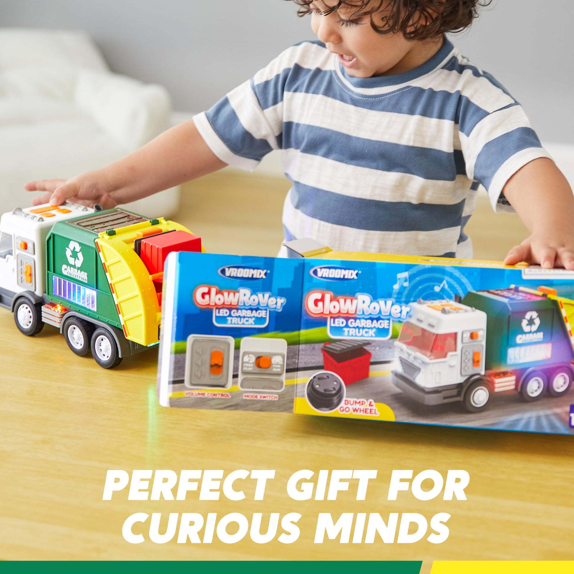 - Fun Run Mode: Activate 'Fun Run' mode to watch the GlowRover autonomously navigate around obstacles while simulating the lively sounds of a trash truck toy. It's non-stop fun on the move, ideal for boys who love trucks for boys and vehicles