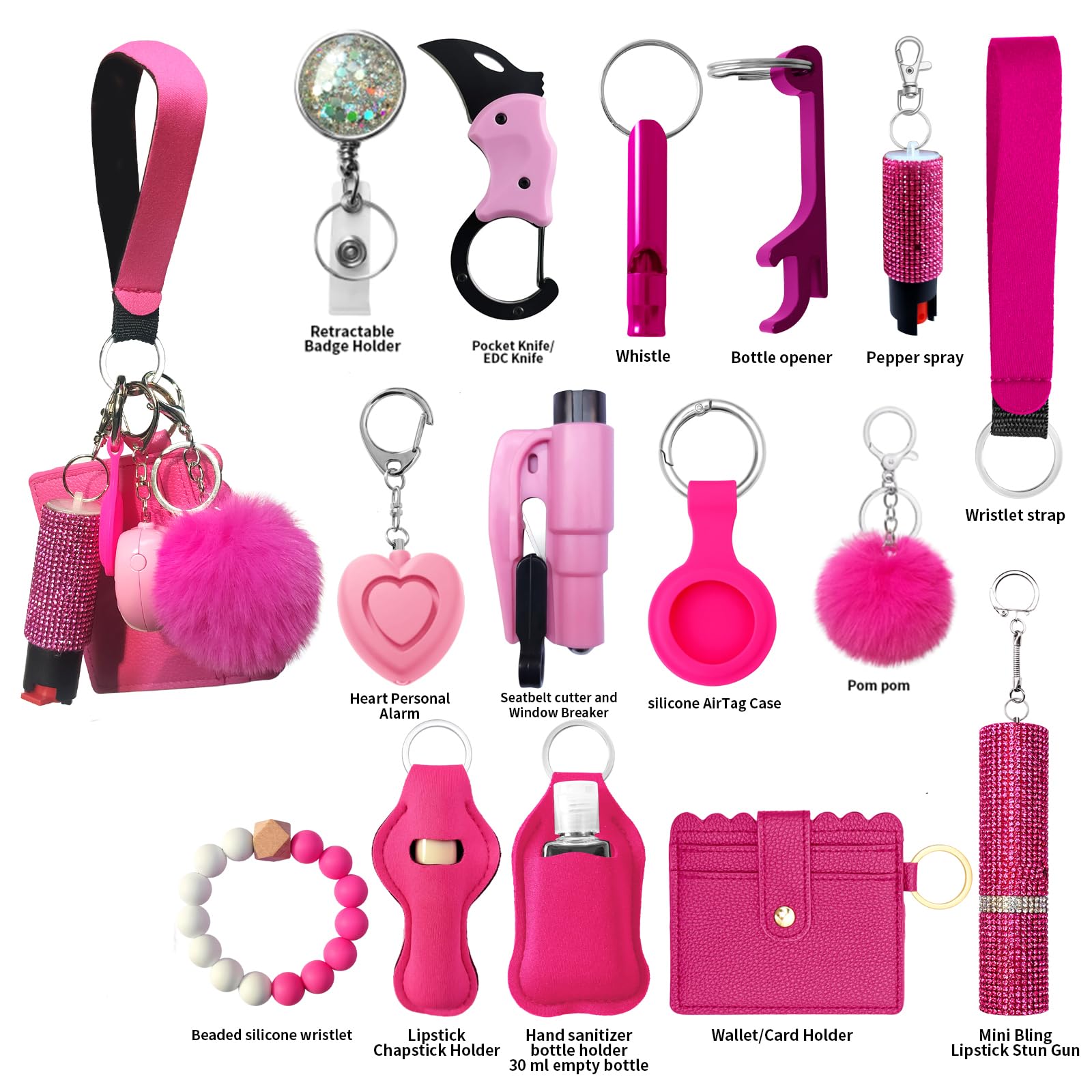 - Keychain Set Including: Lanyard, Wristlet Strap, Pom Pom, Personal Alarm, Whistle, Chapstick Holder, Bottle Opener, Air tag Holder and Other Women Keychain Accessories