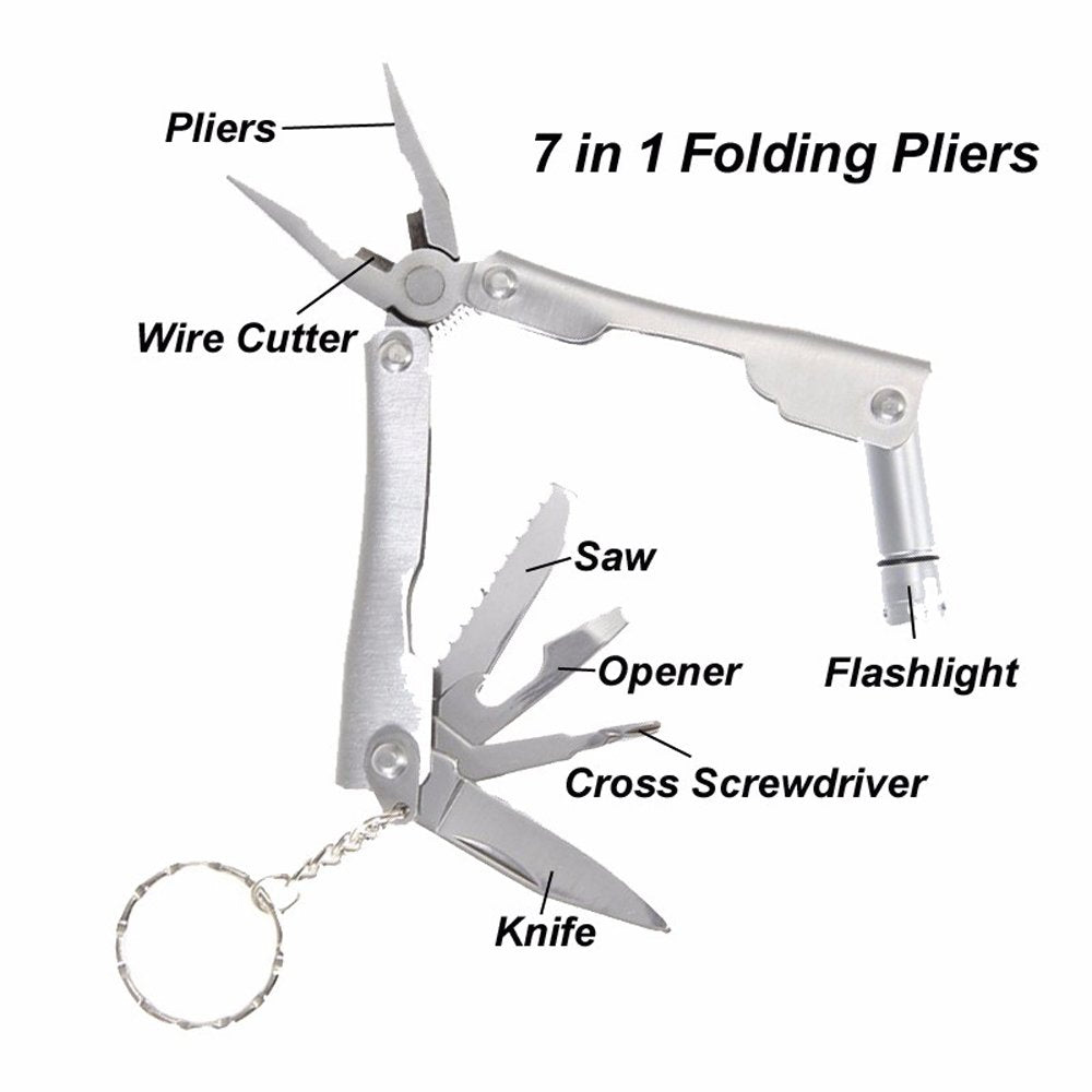 - Ultimate 7-in-1 Survival Kit: Including stainless steel versatile tool card, fire Starter, compass, wire saw,emergency whistle,multifunctional Pliers and carabiner. One case can meet your different needs