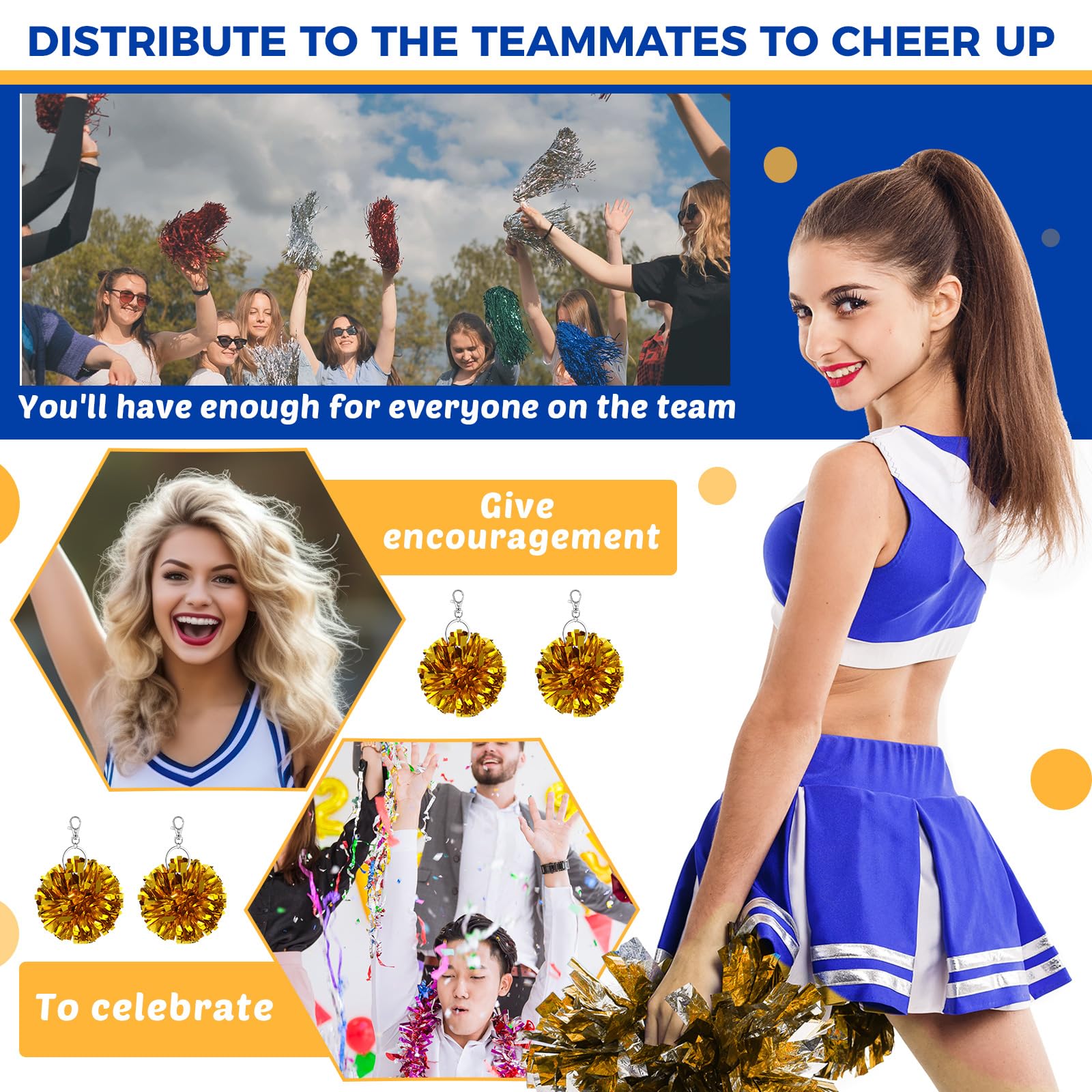- Sturdy Material and Vibrant Colors: these pom pom keychains are made of quality plastic and metal for durability, and feature nonfading, shimmering gold foil; They catch the eye, boost cheerleading spirit, and show your strong support for the team
