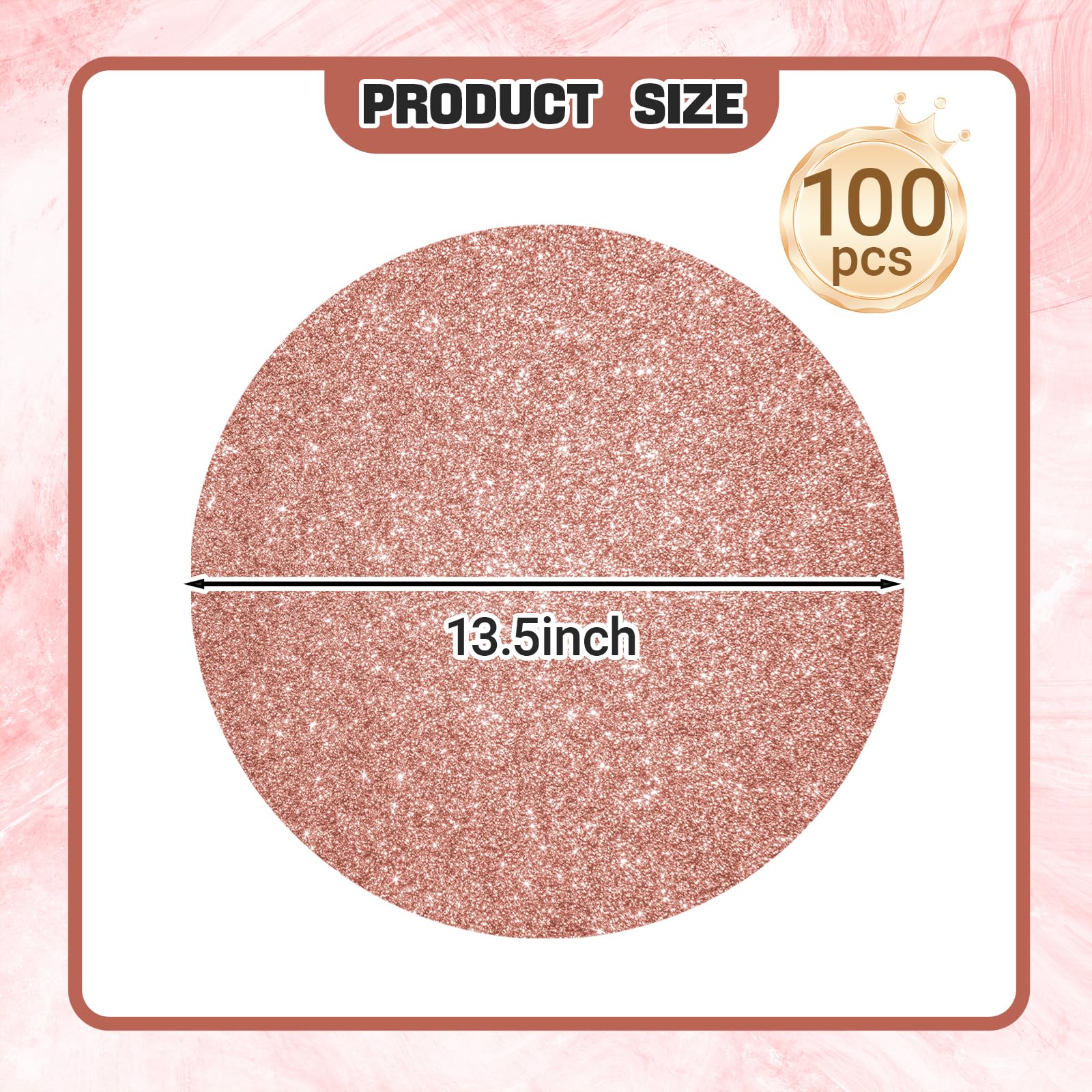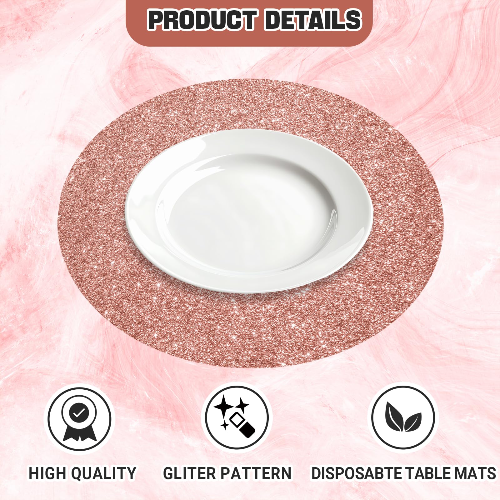 - 100 Pieces Quantity: 100 pieces of rose gold charger plates will elevate the atmosphere of every party! Each paper placemat is embellished with rose gold sequins that instantly elevates your table decoration