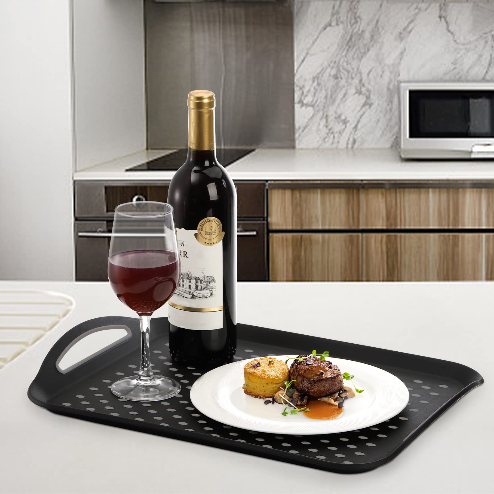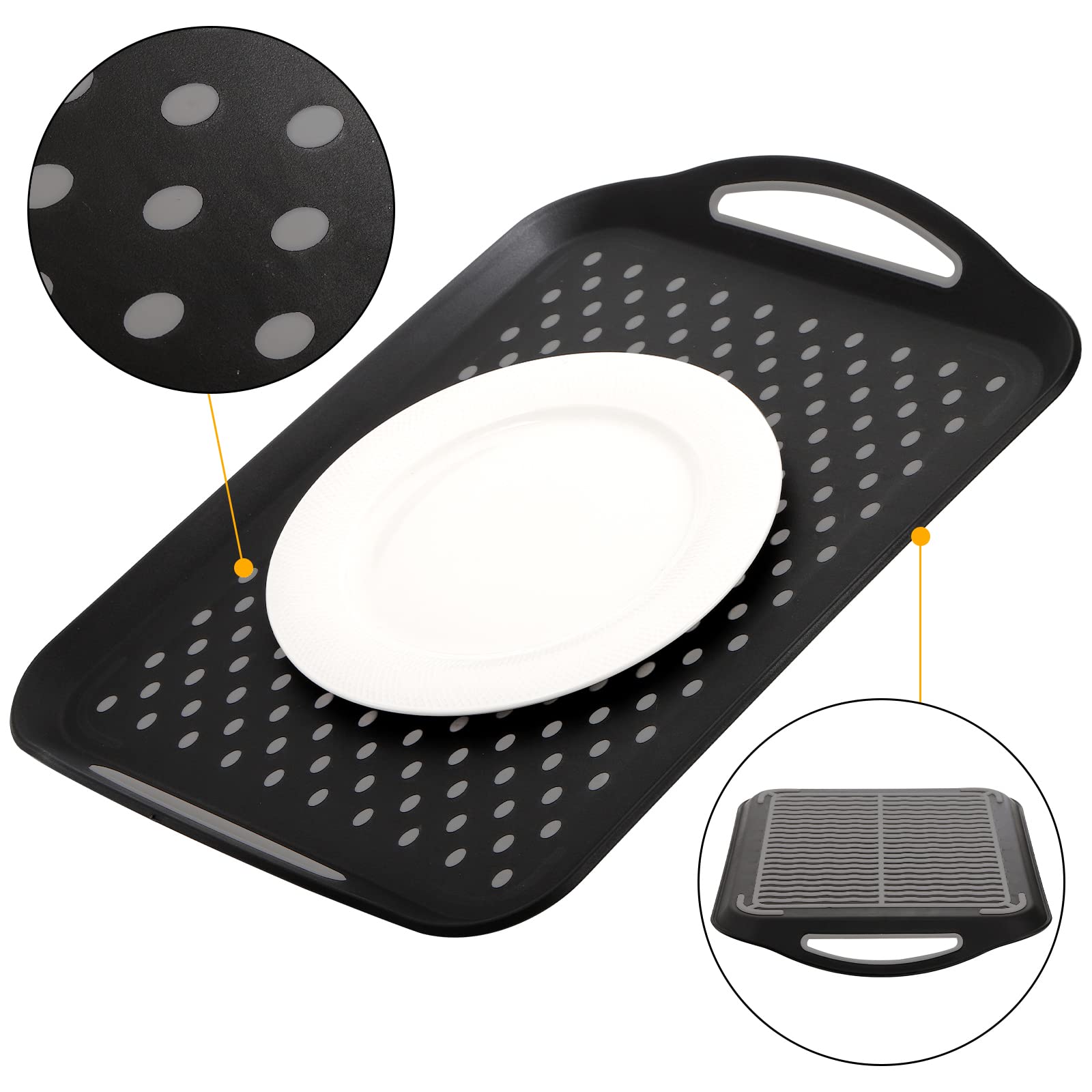 - The non slip server tray with backing rubber line can stop food tray from sliding and keep stable on counter, the small rubber pods on surface are ideal to hold food containers in place, They can work well in car during traveling, also used as a lap TV tray, no more making a mess when you eat dinner in front of TV.